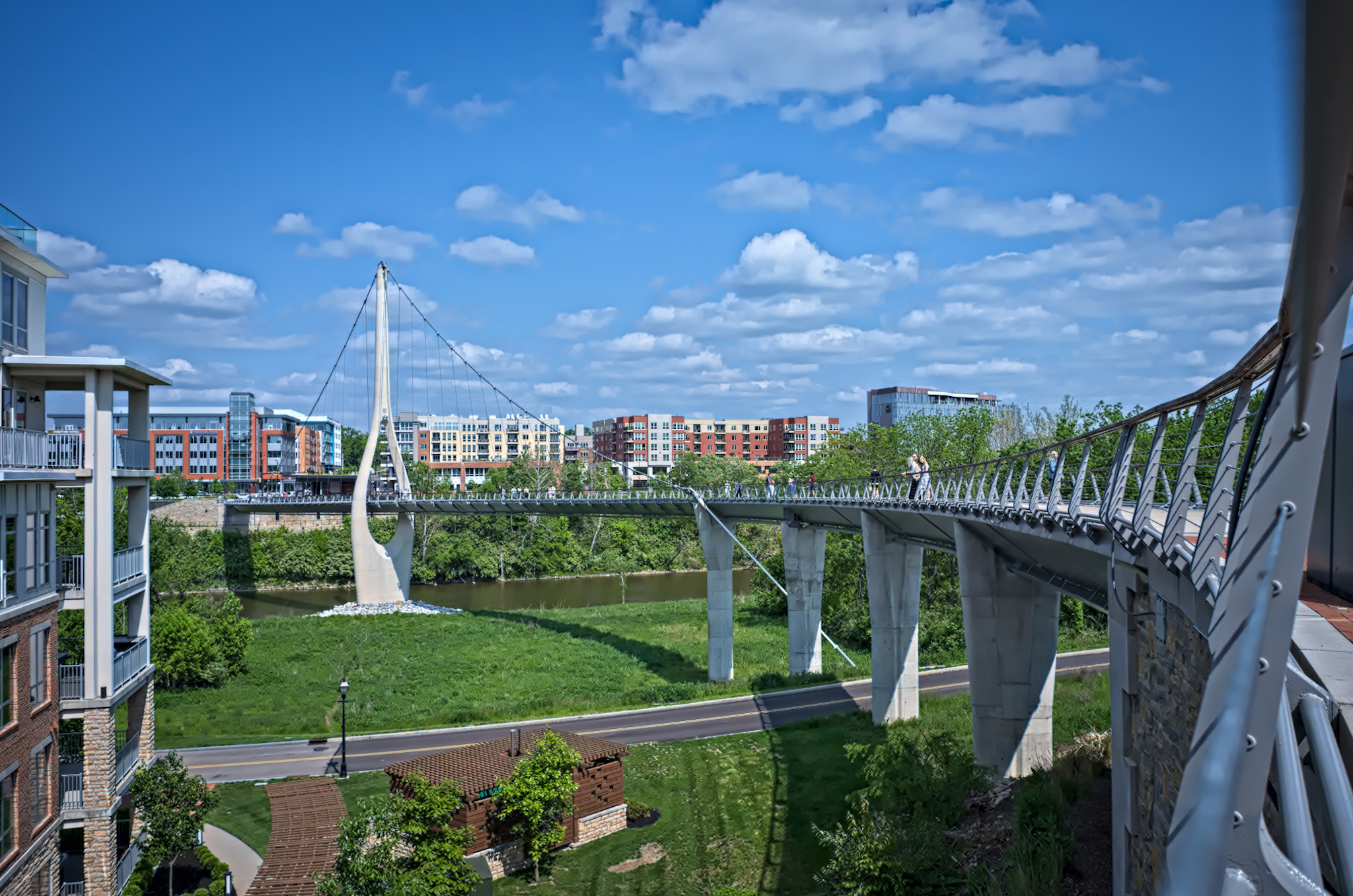 The Link Bridge spans 760 feet over the Scioto river, and is the longest single-tower S-shaped suspension bridge in the world. It was opened for pedestrian traffic in 2020 and is a highlight of the Dublin Bridge Park district. This bridge sits 169ft high and is an impressive sight to see.